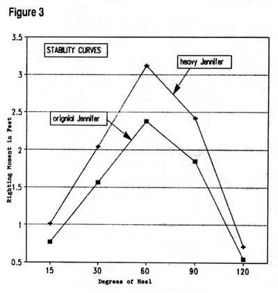 Ultra Light Displacement Boats - U.L.D.B.s typically weigh as little as one half as much as a conventional displacement hull sailboat. At the same time they usually exhibit twice the cruising speed of a moderate displacement design, along with being easier to handle and less expensive for their size. Although U.L.D.B.s have been around since the turn of the century in the Scandinavian counties, the most notable U.L.D.B. built in recent times was Bill Lee's "Merlin". Today's U.L.D.B.s are commonly built of high technology materials with ballast ratios around 50% of their total weight. These long, sleek, feather weights tend to sail on their ears, making them less desirable as cruising vessels despite their other advantages. Interiors also tend to be spartan with little load carrying ability for cruising stores. Many sailors are quick to point out that U.L.D.B.s are an unhealthy trend in that they are built too lightly (not strong enough), and that their high angles of heel make them uncomfortable and unsafe. The fact is that much experimentation is being done on the construction for boats of this type and there is still a lot to be learned. A boat that is capable of speeds in excess of 20 knots, which U.L.D.B.s are, require a hull structure considerably stronger than a boat that can not exceed 10 knots. At the same time I can not argue with the fact that high ballast ratios and slack bilges give these boats a tendency to lie down in moderate winds. My own research into U.L.D.B.s has lead to a somewhat different train of thought, which can generally be expressed as “less ballast, more beam”. Narrow waterline beam is as much a factor in the speed of an U.L.D.B. as is its light weight, but lack of flair in the topsides reduces interior space and lowers the angle of heel at which the boat will right itself. ![]() Most of today's designs have shorter overhangs, which gives a longer waterline allowing narrower beam and a shallower hull. This gives an impression in the water of a much larger, sleeker vessel without added weight, giving the boat a lighter displacement/length ratio. Lowering the ballast ratio (essentially dead weight), lowers the displacement required, making it easier to achieve an ultra light displacement. Ballast is the greatest single weight in any boat. By reducing ballast more weight can be saved then any other single item. This also relieves the hull of a concentrated strain, thus avoiding heavy framing in way of the ballast. Many people believe that ballast is stability, while in fact it is the center of total weight and the hull form together which are the key factors. Ballast is a way of lowering the center of weight while adversely affecting the hull form. It is possible to get very good stability without ballast; just ask any multihull owner. Ballast really becomes effective at high angles of heel whereas hull form (as in a multihull) is effective at low angles of heel. The interplay of ballast and form stability is the compromise every Architect has to make in designing a boat. Heavily ballasted boats tend to sail at high angles of heel because of their poor form stability. This is caused by the slack bilges and deep sections needed to get the required displacement to carry all that ballast. Less ballasted boats do not require as much volume under water, so their New U.L.D.B. hulls are shallower. The shallower hull has more stability at low angles of heel and is more comfortable to sail. The trick in any design is to get good initial stability from the hull form while using enough ballast to give adequate range of stability for safety. I once read an article by an Architect of repute that stated that anything over 30% ballast ratio was a waste of time. He went on to point out that as you increase your ballast ratio you devastate the hull shape. You do increase the ability of the boat to carry sail, but at a higher angle of heel. What is more, the distorted, heavier hull form has more resistance. Preliminary work carried out by my company, Bray Yacht Design And Research Ltd., has indicated resistance goes up twice as fast as sail carrying ability. Still, ballast ratios have continued to go up. ![]() Let us have a look at the effects ballast ratios have on displacement. Using "Jennifer" which was designed for Cruising World's design competition, let us try 50% ballast, and then 25% ballast. The design originally has a conservative ballast ratio of 37%. Jennifer's displacement is 11,500 lbs. of which 4000 lbs. is ballast. To get a 50% ballast ratio the displacement needs to go up to 16,000 lbs., with 8000 lbs. of ballast. Quite a jump in displacement and double the ballast to gain an extra 13%. Its a vicious circle. More ballast means more weight so more ballast is required to get that 50%. We cannot simply add 2000 lbs. to the original 4000 lbs. because that pushes up the displacement too.