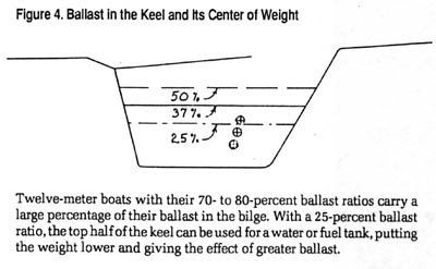 BALLAST IN THE KEEL & IT'S CENTER OF WEIGHT 12 meter boats with their 70-80% ballast ratios carry a large percentage of their ballast in the bilge. With a 25% ballast ratio the top half of the keel can be used for a water or fuel tank putting the weight lower giving the effect of greater ballast. Reference Material.