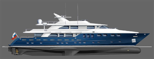 ![]() Ocean Series 45m Motor Yacht This long-range motoryacht was designed for a Russian client and has a much more European flair than most of our designs. It was made for entertaining with a formal main salon, a more casual library/lounge with fireplace and a dramatic forward dining room. The vessel has a large owner's apartment on the upper deck which extends out onto a private deck. There is also a huge walk in closet and very spacious bathroom. Directly forward is a stateroom for family or security personnel. The captain's cabin and ship's office are both right behind the bridge. The main deck has great outdoor space with large glass doors that open up into the main salon. The library/lounge has large panoramic windows. Forward are the galley and the main dining room. Below decks are four large guest staterooms while forward there are accommodations for eight crew and a crew lounge. Aft of the engine room is a tender garage housing a 23 ft. runabout as well as jet skis. The flybridge has large sun pads, lounging space, a dining area, barbeque and bar. A hardtop for sun shade is provided over the central area. The super fuel-efficient, semi-displacement hull form that has been thoroughly tank tested with our latest hull technology to ensure superior powering characteristics and seakeeping. The hull is a conically projected, double chined form with wide spray knocker, flared bow, and a transom stern. It is longitudinally framed with wide spaced transverse frames for maximum strength. This vessel has in excess of a Trans-Atlantic range at 12 knot cruise as well as being capable of higher semi-displacement speeds for local cruising.