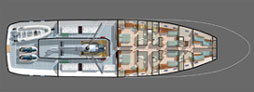 The lower deck features four spacious guest cabins with extra-large port lights to provide enhanced natural light and viewing.
