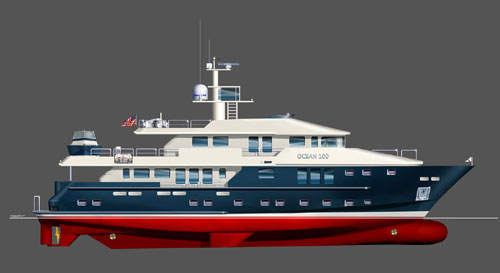 ![]() Ocean Series 42m Explorer Yacht This long-range motoryacht has been designed for a client who enjoys cruising in remote locations. He is also an avid fisherman and diver, hence the ability to carry and launch a 30 ft. sportfish. There is very spacious accommodation for 10 guests and up to 10 crewmembers. It has a super fuel-efficient, semi-displacement hull form that is a progression of our extensively tank tested hull technology to ensure superior powering characteristics and seakeeping. The hull is a conically projected, double chined form with wide spray knocker, flared bow, and a transom stern. It is longitudinally framed with wide spaced transverse frames and close spaced stringers for maximum strength and ease of construction. Advanced technology appendages, including a bulbous bow, midship bulb, stern bulb, fixed/active stabilizers, and a bi-foil under each propeller, are the features that make this vessel unique. In addition these features give the vessel superior seakeeping ability as well as having double the range of stability of other vessels. This vessel has in excess of a Trans-Atlantic range at 12 knot cruise as well as being capable of higher semi-displacement speeds for local cruising.